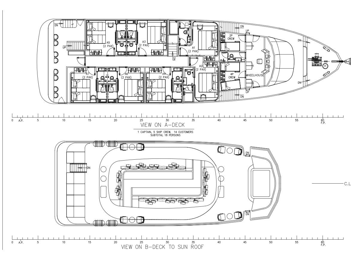 With our vessel measuring in at 35m by 9m with four spacious deck levels and a maximum of 20 guests - there is more than enough room for everyone onboard.